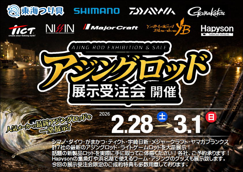 来週末の2月28日(土)3月1日(日)に「アジングロッド展示受注会」を来週末に開催します♪